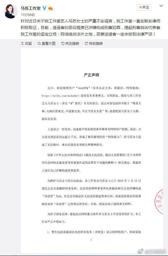毕竟黄毅清发了一系列微博内容都说是实锤,而且群众也认为新娱乐圈纪委书记指向的就是马苏,如果黄毅清在法庭上抗辩文中说的 M 并不是马苏,那就打了自己的脸,大可以被马苏的公关团队推一波,洗白马苏,反转剧情。