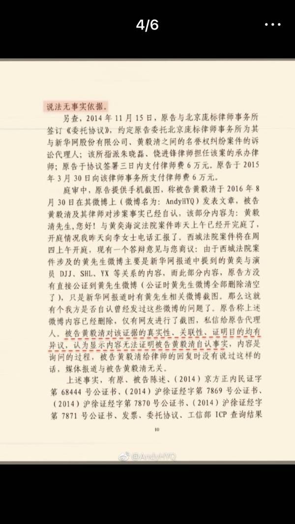 至于黄毅清能否进行这样的抗辩,他的微博上置顶内容「感谢法律的公正」——对于黄奕起诉侵害名誉权的案件中可窥测一番。这条微博发的挺败笔的,在这个节骨眼上,显然自己揭了老底,承认自己有「敢说不敢认」的经历。