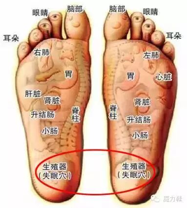 生殖腺位于双侧足底,一是在跟骨的中央处;二是在外踝后下方呈直角三角形的区域。