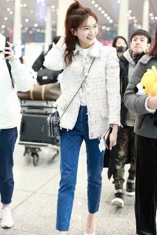 今年的时装周白色真的成为第一流行色,江疏影身上这件白色外套是CHANEL家的春季新款,包包也是,但牛仔裤格纹和衣服撞了,就感觉不太好看。
