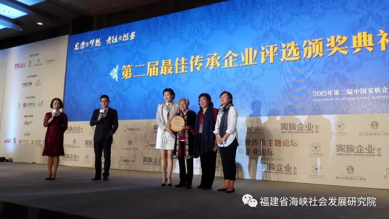 晚七时,第二届最佳传承企业评选颁奖典礼正式开始,共颁出个人及机构奖项八个,其中包括“最佳女性贡献奖”( 马静芬女士——褚时健妻子荣获)、“2015茅理翔家族企业研究学术成果奖”等。