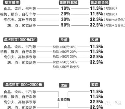 对于超出部分,将按照进境物品归类征税,食品饮料、部分电子产品、金银、家具等税率由10%上调为15%,衣帽服饰税率由20%上调为30%,部分烟酒、化妆品等税率则由50%上调至60%。