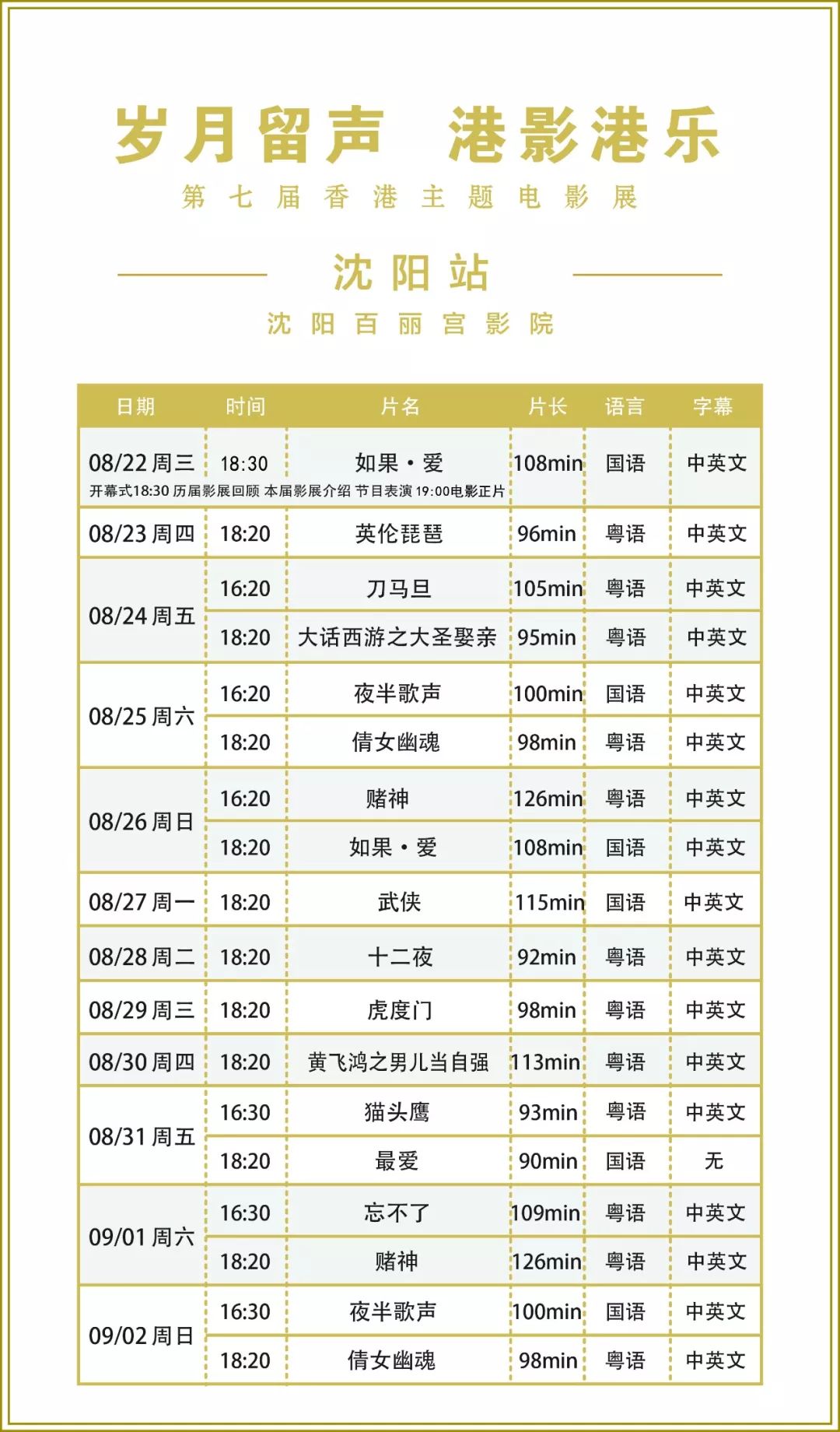 沈阳站展映时间为8月22日—9月2日,在市府恒隆百丽宫影城举行14部影片的展映。