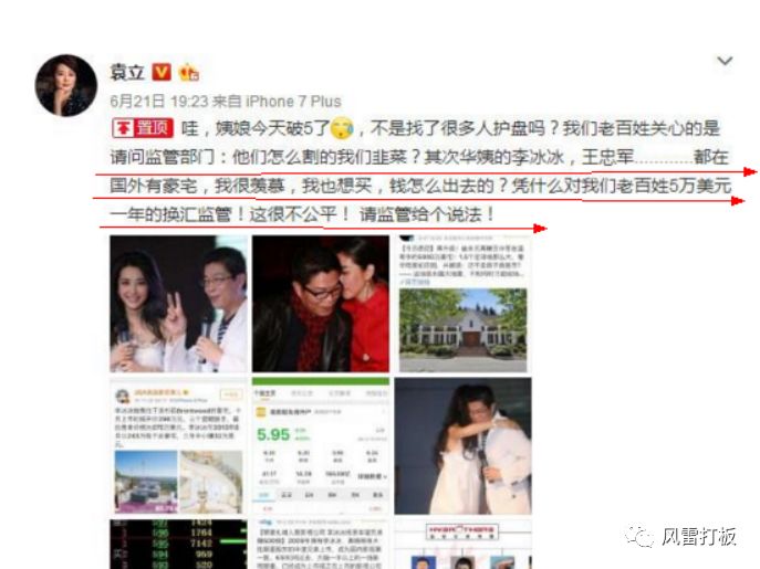 自从崔永元爆光范冰冰以后,华谊兄弟股票市值砍掉30%,王中军中间还自救过,还是挡不住跌势。扬子黄圣依又被曝光,而今天演艺圏直女,直撕华谊李冰冰,老百姓一年只有5万美元的换汇额度,风雷算了一下,1000万美元的豪宅,要用200年左右才能转出去,莫非,明星们的祖上在清朝就开始干这事,大部分人问监管他们如何转移财产去美国的。