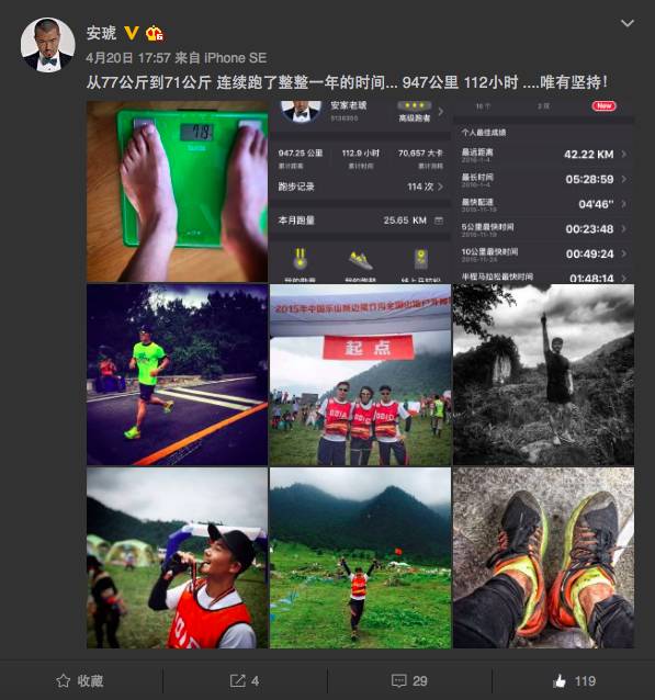 目前安琥已经跑步一年有余了,累计跑了130多个小时,共1000多公里。连安琥这样的明星都这么努力,大家也要加油了噢!