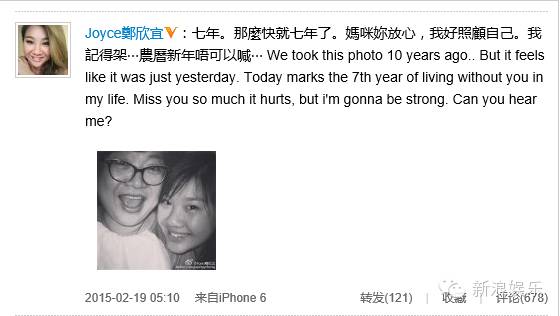 去年,郑欣宜曾在微博上对妈妈说:妈咪你放心,我会照顾好自己。并贴了一张十年前的照片来怀念妈妈。