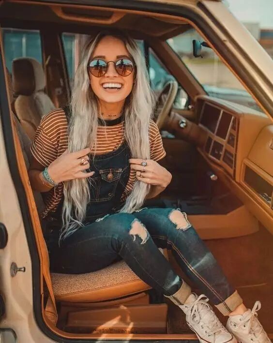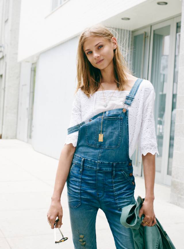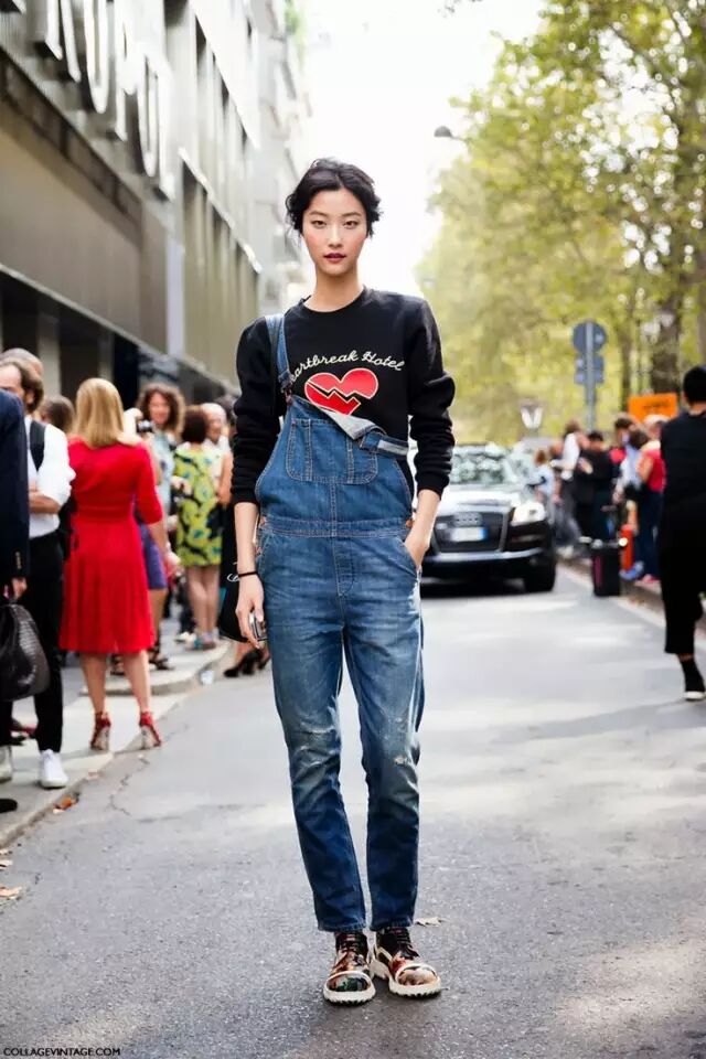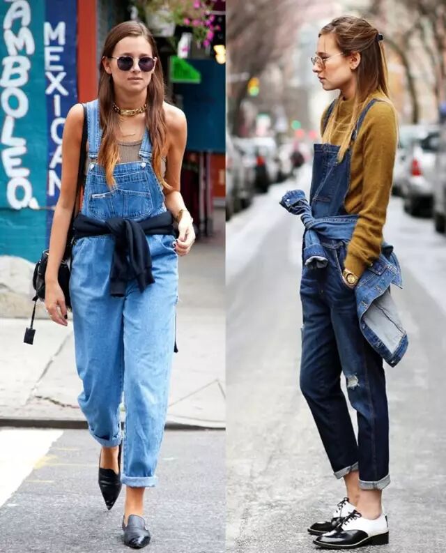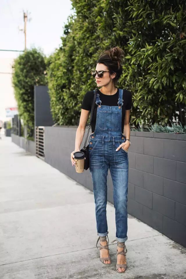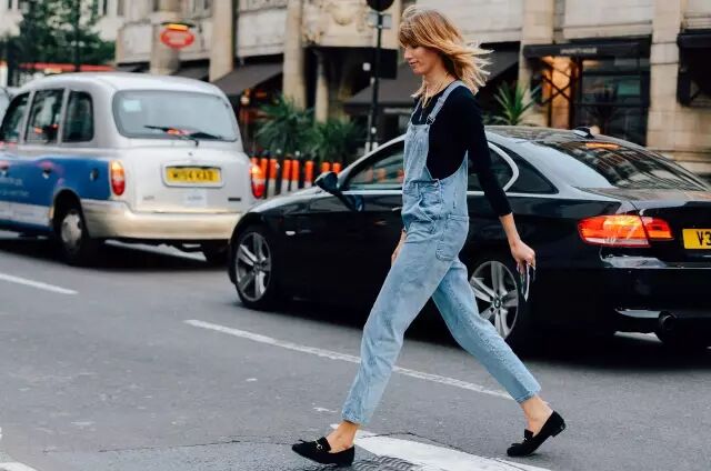 丹宁色是背带裤最常见的颜色,由于是休闲搭配,鞋子最好也是休闲的。