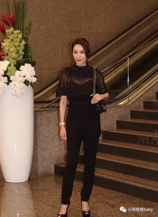黑色是一个很显瘦的颜色,有一定的神秘感,很能称肤色让女性看上去更白。上半身的雪纺设计比较适合手臂有肉的女性朋友,让整个人更加的苗条。而且这样的造型,会让郭可盈看起来更加的有层次感一些,很有女性的风情非常的妩媚。40多岁的女性朋友们日常也可以选择这样的服饰。