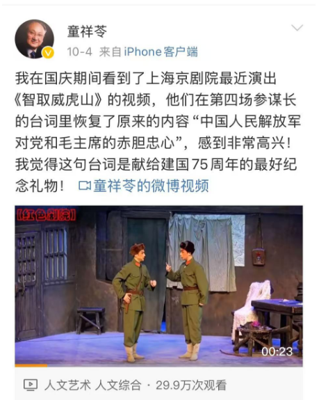 1958年,上海京剧院一团根据小说《林海雪原》并参考上海人民艺术剧院的同名话剧创排了现代京剧 《智取威虎山》。作品问世后极为轰动,由童祥苓饰演的“孤胆英雄”杨子荣更成为了几代人心中的永恒记忆。