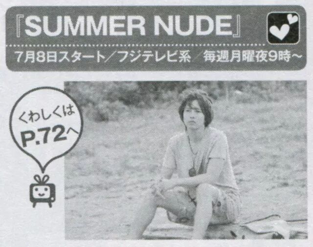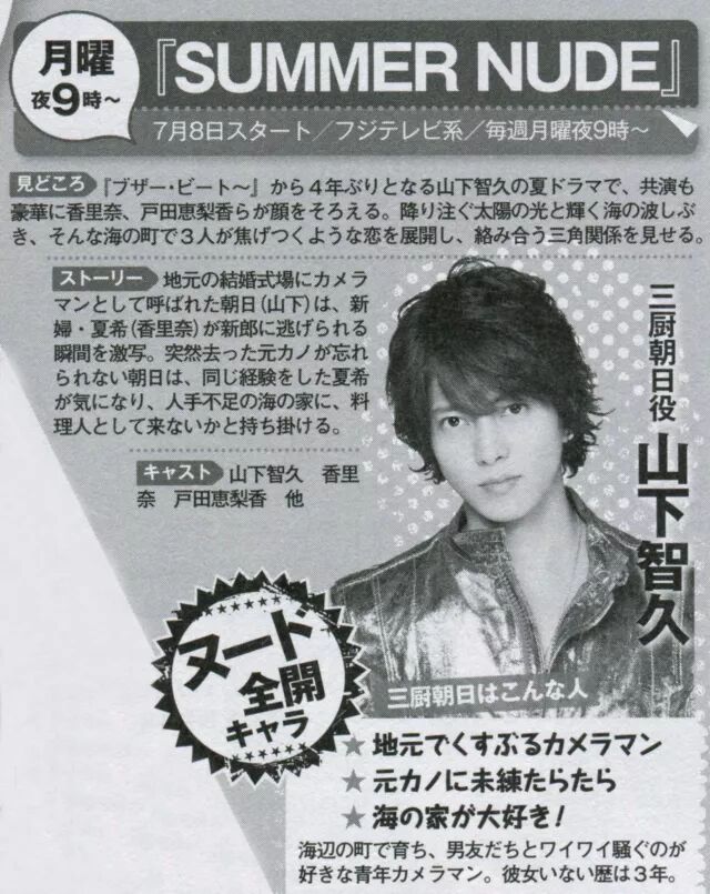 这个夏天NUDE的山p让整个日本都有了恋爱的感觉!电视剧<SUMMER NUDE>(富士电视台 周一晚上9点~7月8日开始)对主演山p关于夏天的回忆和“NUDE”的瞬间进行提问!