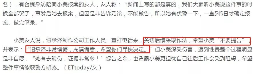 犯事的时候是胆大包天,但意识到受害人有报警的意图之后,钮承泽方面就开始怂了。