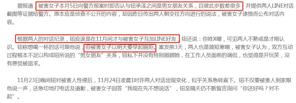 根据女方公开的聊天记录显示,钮承泽和受害者之前并无太多互动: