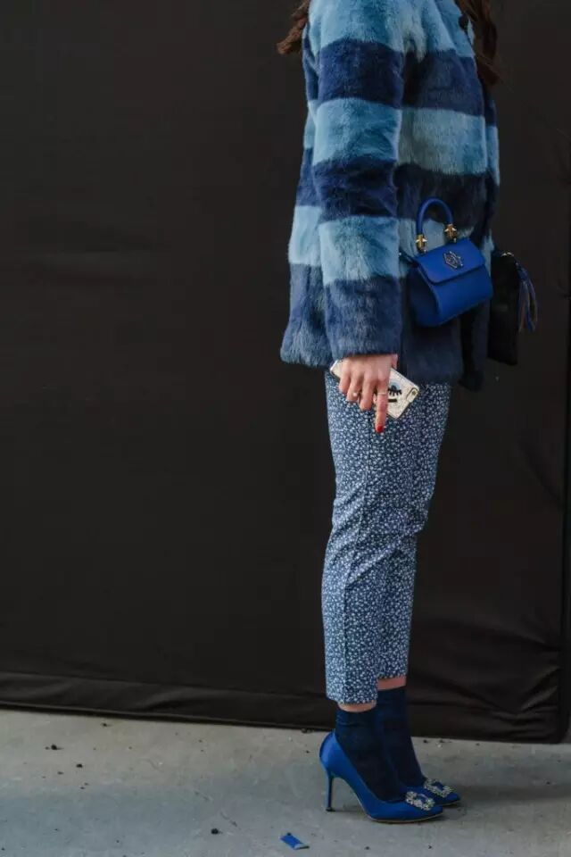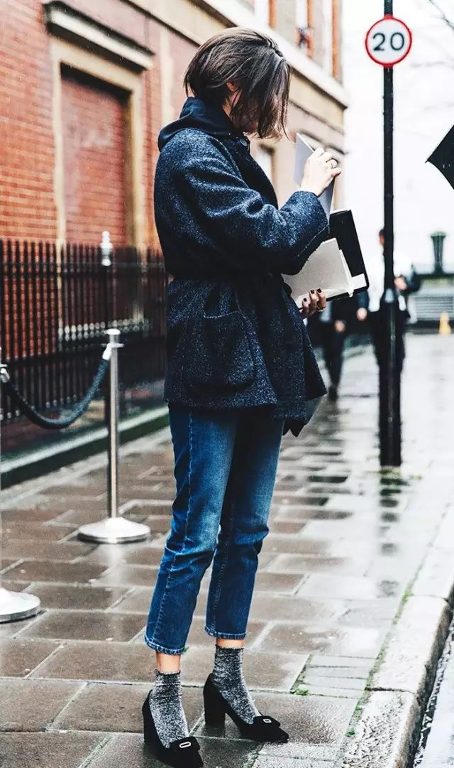 鞋子和袜子同色可以起到一个衔接的效果,让鞋子看上去和短靴一样连贯完整。用短袜搭配鞋子,既保留了鞋子的造型设计,又实现了保暖的需求,时髦实穿两不误。