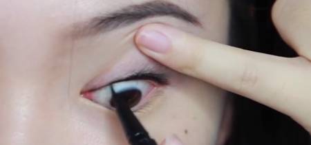 step1:用手指按住眼皮往上提,顺着内眼线开始画