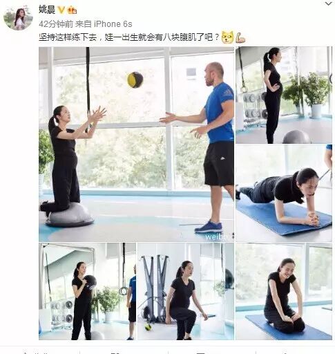 去年,孕期中的姚晨在微博上发了一条健身照片,并附文:坚持这样这样练下去,娃一出生就会有八块腹肌了吧。