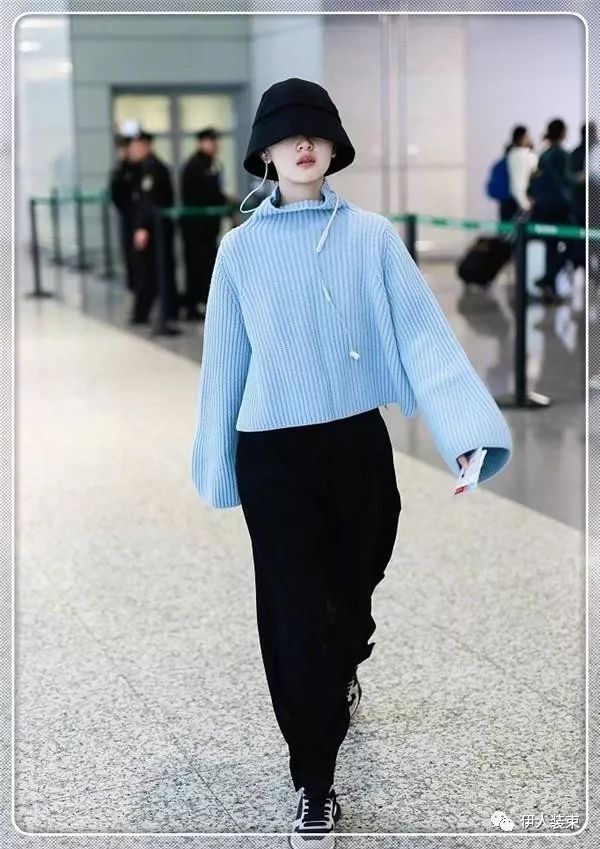粉蓝色的针织衫看起来真的是太粉嫩了,对于二十多岁的女孩子而言都不一定可以驾驭,不过周冬雨本身就显小,穿起来倒是十分的适合,小小的渔夫帽遮住半张脸也显得整个人个更加的小巧。