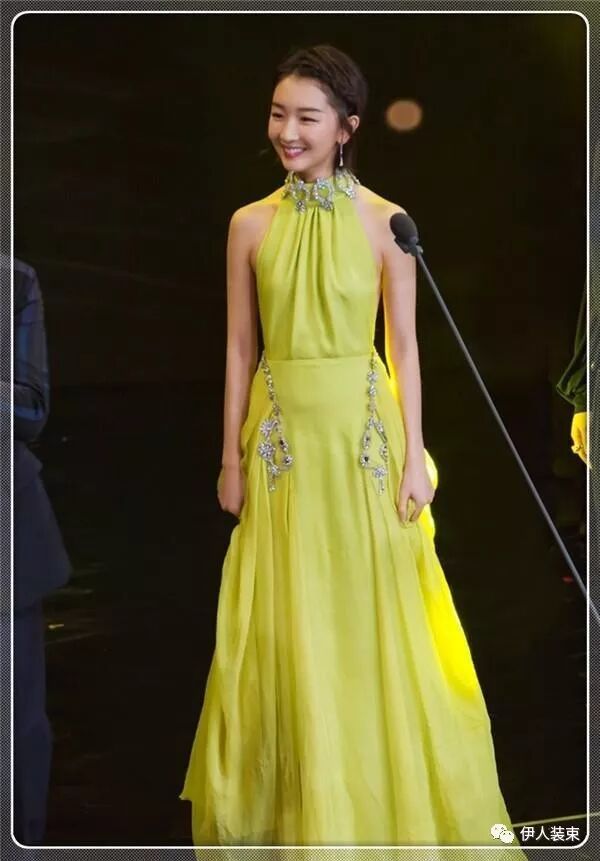 鲜艳的暖黄色礼服裙简直是对周冬雨这样年纪稍大,但是气质清新,长相显小的女孩子量身定做的,让她看起来优雅大气的同时不失几分清新文艺。