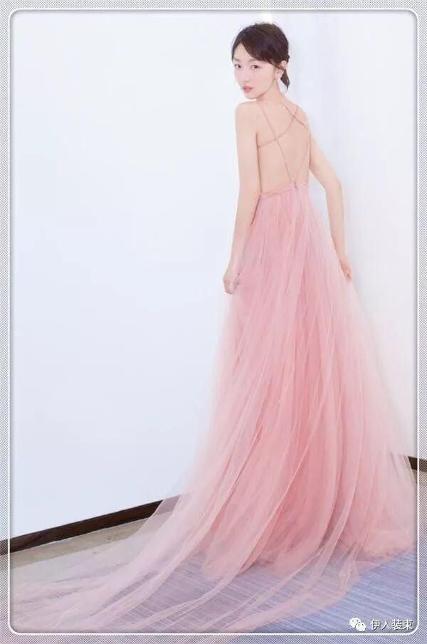 如果说日常穿的粉色连衣裙会显得过于粉嫩,难免会给人扮嫩的嫌疑,但是这身露背的粉色礼服裙就很是性感优雅了,穿在周冬雨的身上满满的都是梦幻唯美的气息。
