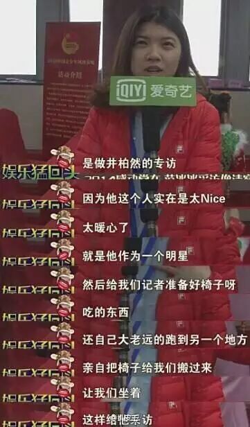 开始采访了,因为坐的沙发比较低,如果蔓笛站着采访的话,井柏然上镜会不太自然。“'我去给你找椅子',井柏然这么跟我说,然后他就满房间的跑了一圈,找到了一把椅子,他的经纪人、助理什么的,就站在一边也不帮他,所以我看到一个明星这样做,我心里还是挺感动的。”蔓笛说。