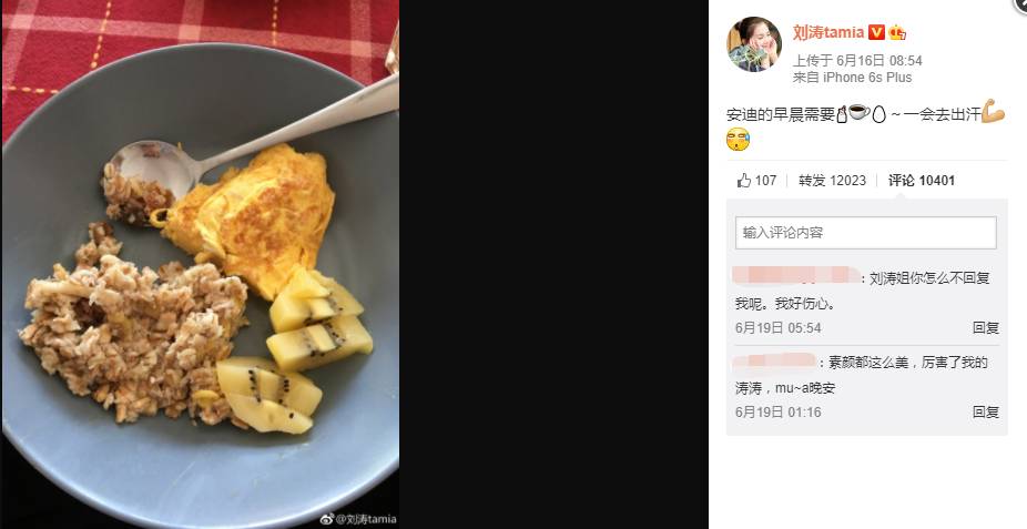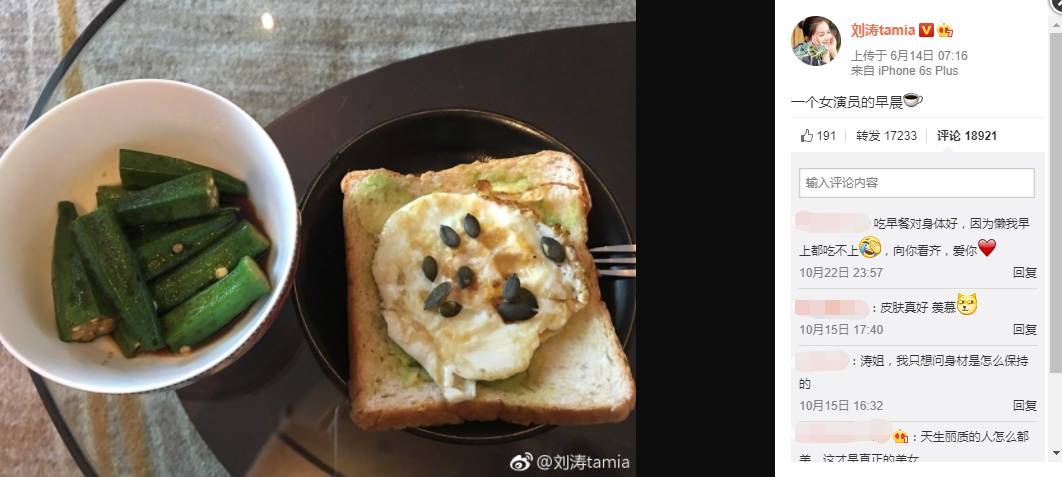 翻看刘涛微博可以发现,女神保持好身材的秘诀,饮食上都少不了遵循简单健康营养的准则,一张早餐随手拍就能看出刘涛对吃有多讲究了。