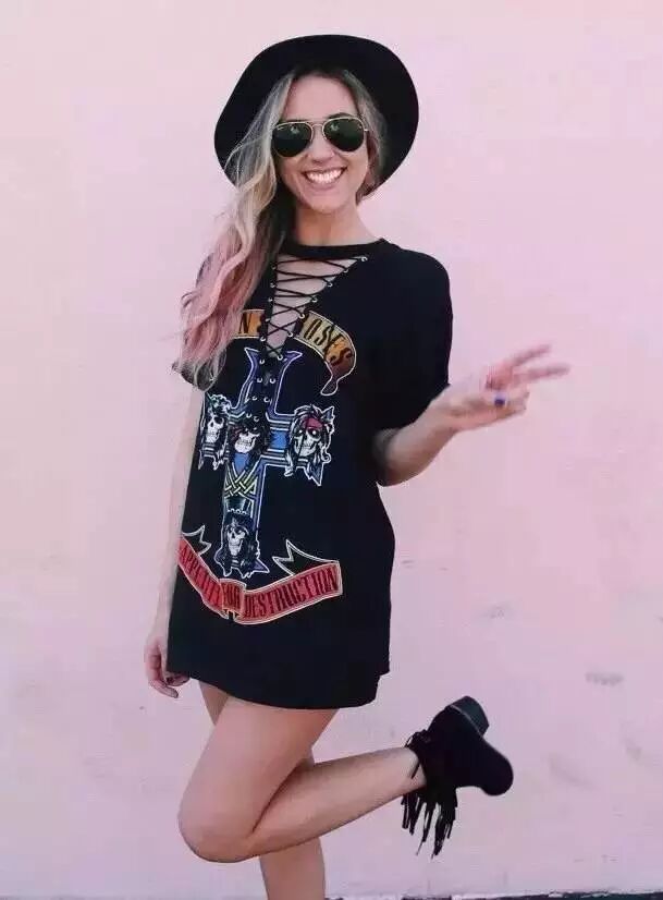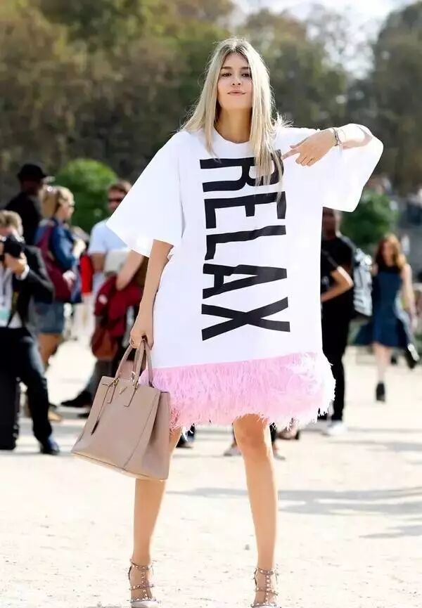 也可以加入一些今年的流行元素,比如绑带,这种酷感和休闲风T恤裙是可以很搭的。
