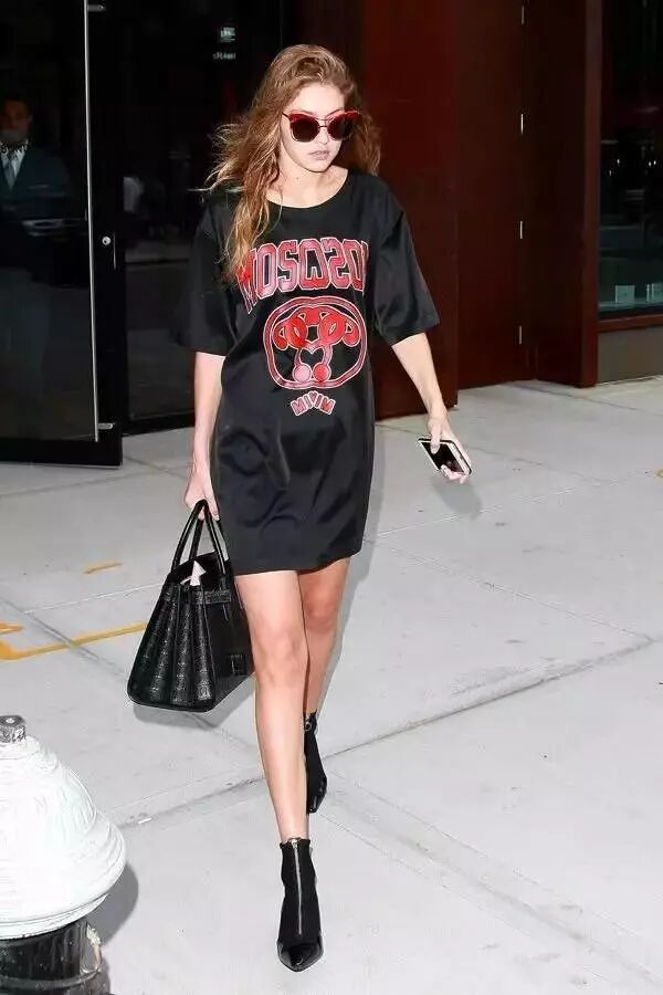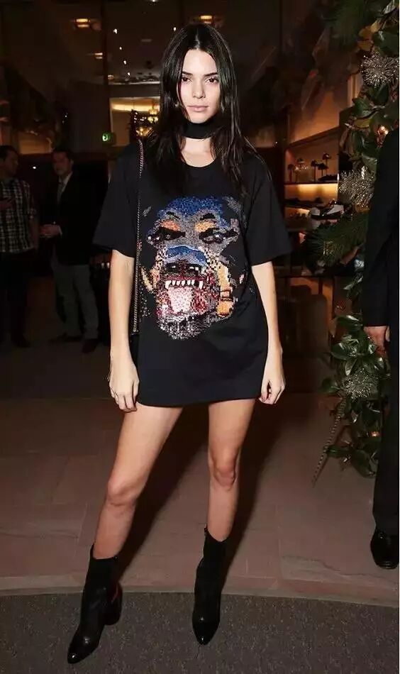 肯豆也超喜欢这样的搭配,超模身材加上黑色印花T恤裙,腿长1米9,野兽图案和宽choker则显得酷劲十足。