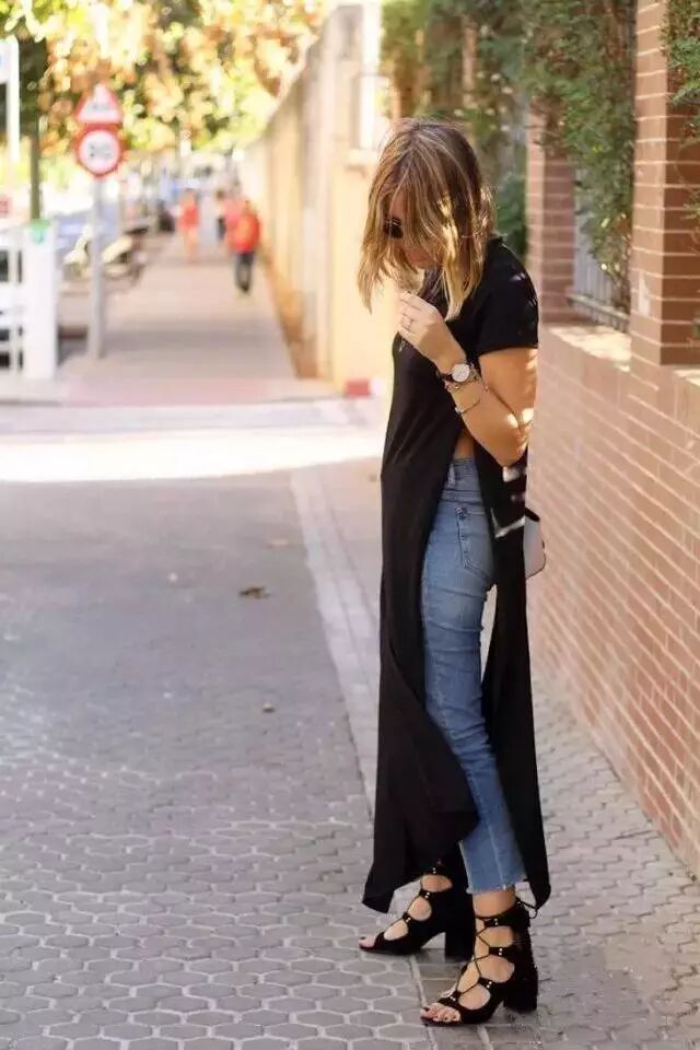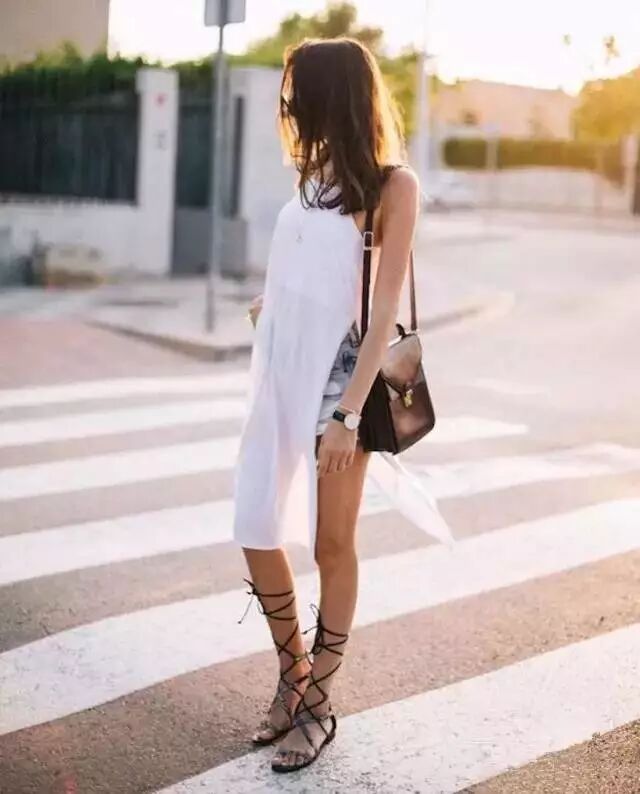 当然你可以选择热裤,超高的开衩T恤裙搭配蓝色牛仔热裤造型利落同时也非常有范儿,一双粗跟的绑带鞋性感又时髦。