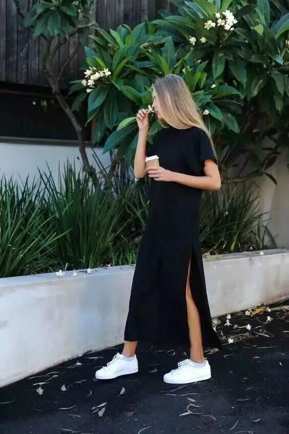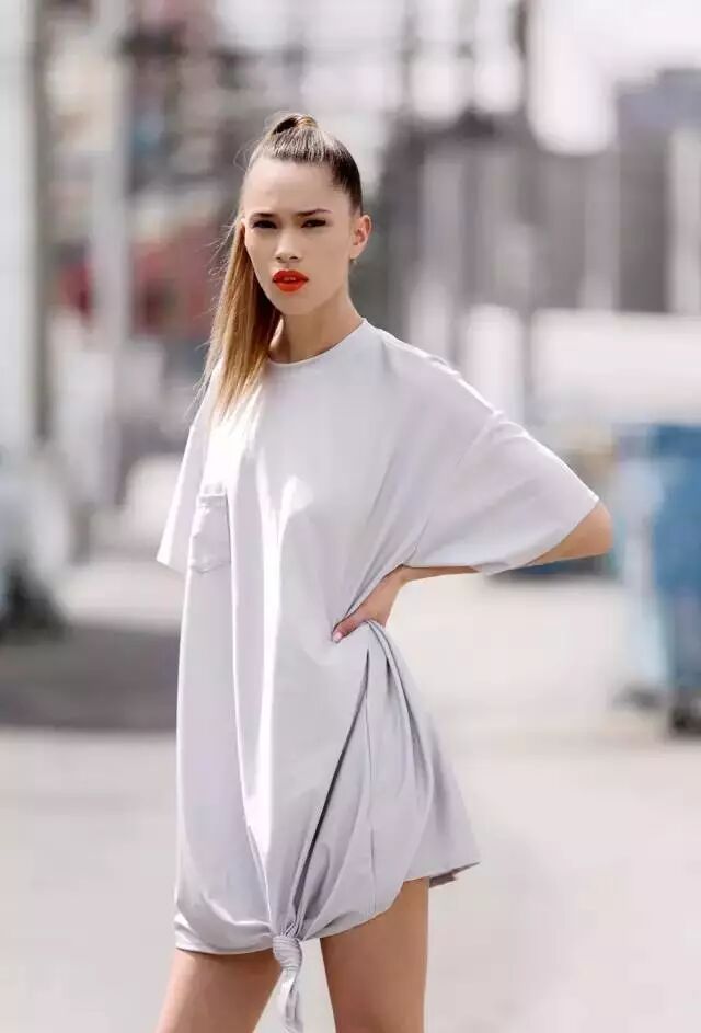 双侧开衩设计的T恤裙,即使是简洁的白色款式也别有风格,与黑色球鞋搭配颇具街头风格。高挑的小仙女穿出自己的气场。