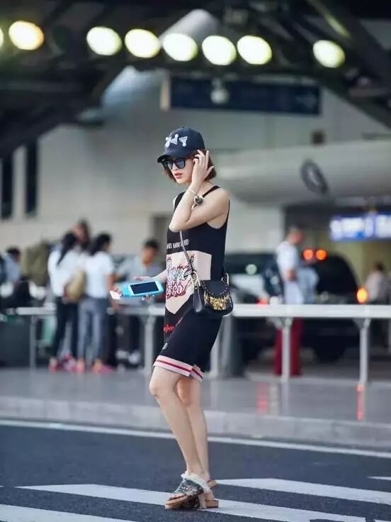 张俪选择无袖的T恤裙搭配一片拖,头戴棒球帽、墨镜,时尚又不乏青春活力,大长腿吸睛。