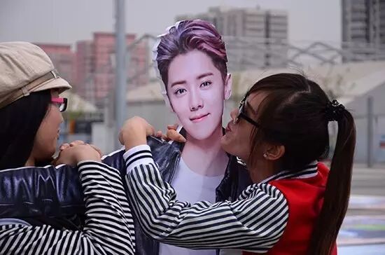 不久前上千鹿晗粉丝为和鹿晗摸过的邮筒合影排队到凌晨三点,日前一幅主题为“和鹿晗看世界”的420米长的3D贺卡,以及多个鹿晗的人形牌出现在海淀区五棵松体育馆附近。粉丝再次蜂拥而至,有的甚至穿上婚纱和偶像合影。
