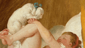 弗拉戈纳尔的绘画以结合迷人的轻盈明快之感与充满反讽的心理洞察意味而闻名。在《Girl with Dog》(少女与小狗)一画中,若不是因为主题人物所展现出的这份天真无邪,其姿势与光影的处理手法可能会给人轻浮淫荡之感。除了画中所透露的情欲意味之外,这幅画作更巧妙地捕捉了法国大革命前富豪们热爱享受豪华与奢侈逸乐的旧制度时代背景。在当时,如此细腻描绘不受拘束的性欲淫荡与自我放纵,堪称前所未见的一大突破