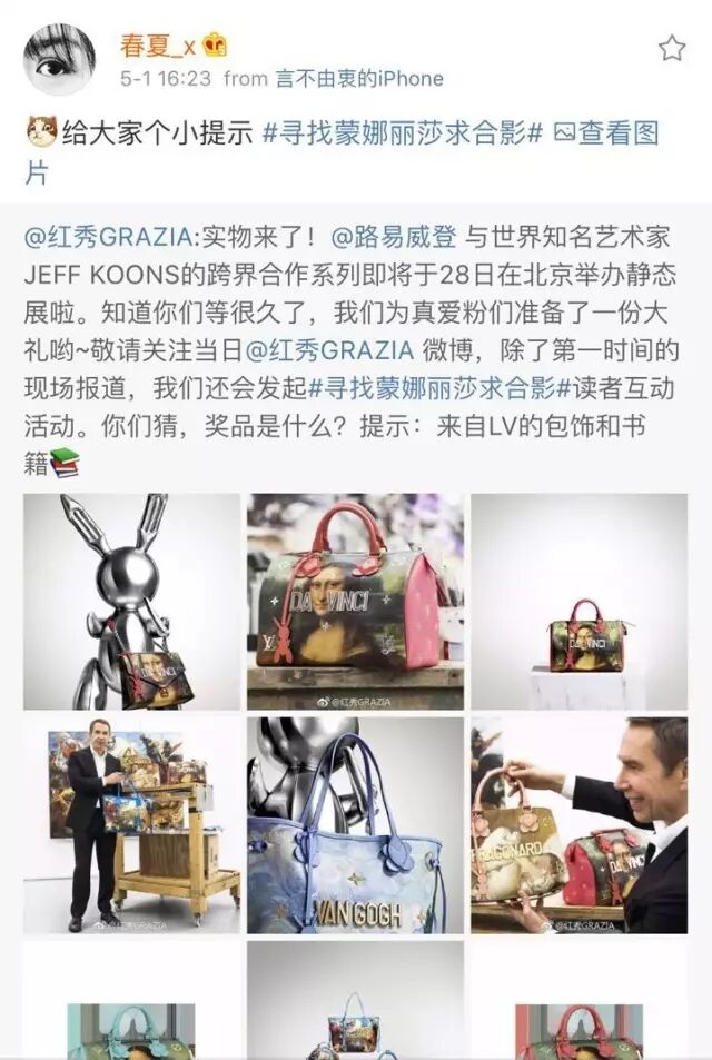 猛敲小黑板:展览在北京SKP 1F 中庭举办,时间从4月28日至5月21日。赶紧去#寻找蒙娜丽莎求合影#吧!活动参与方式:①关注@红秀GRAZIA微博 ②去看展!③在微博上发布自己去看展的照片/合影 ④@路易威登 @红秀GRAZIA ⑤带上话题#寻找蒙娜丽莎求合影#
