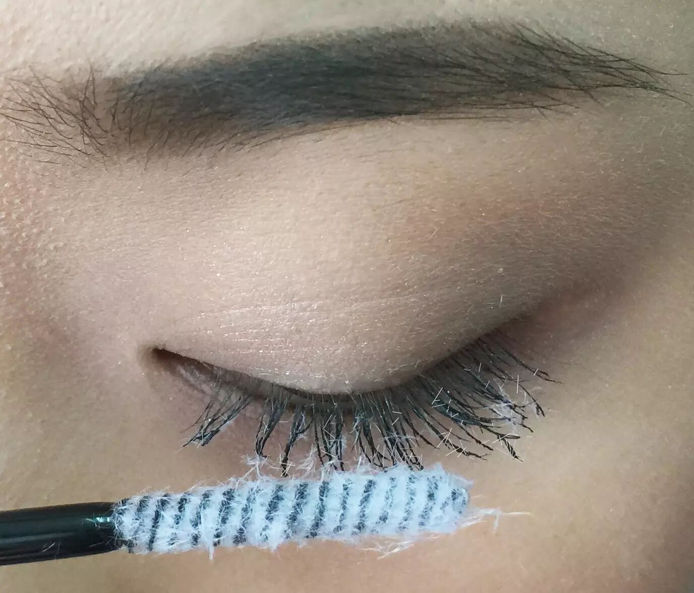 取出“瞬即卷长纤维”(白色干纤维),为了避免苍蝇腿,可轻轻刷拭在睫毛前段的三分之一处,刷头略微倾向30°角,将白色的纤维均匀涂抹。