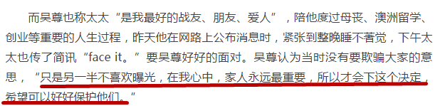 因为女友是圈外人不想被曝光,吴尊就极力护她周全。被爆结婚生子时,吴尊一一否认,但最后还是纸包不住火。吴尊站出来承担了一切,鞠躬给公众道歉。