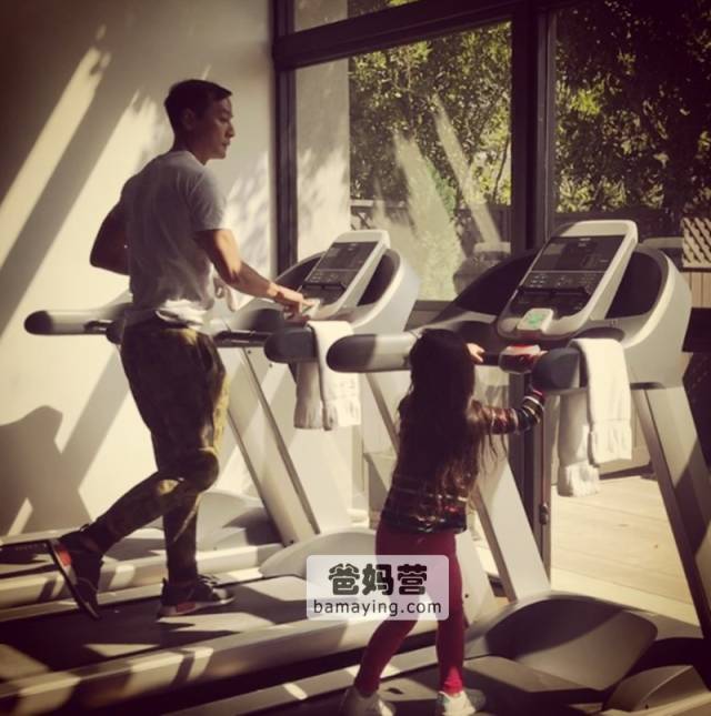 女儿Raven也很粘他,就算健身女儿也要在一边陪着。