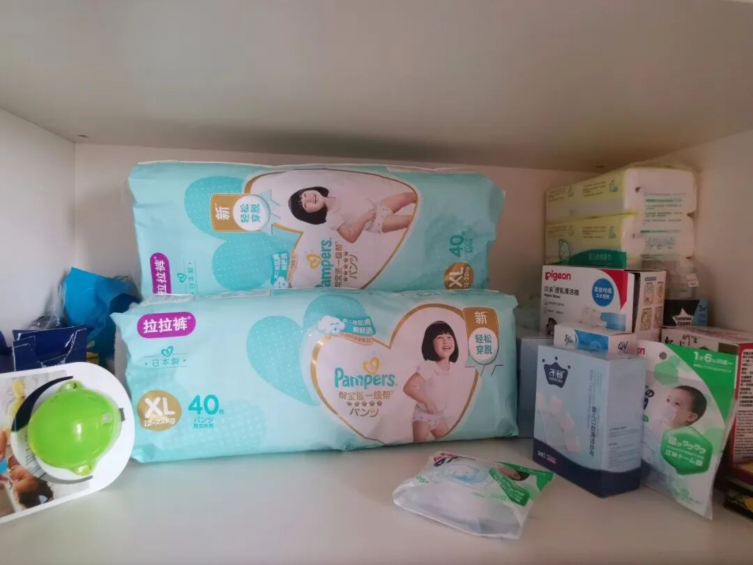 最开始,我给他用的是那种黏贴式纸尿裤,六个月学会翻身后,纸尿裤就有点治不了这个小淘气了,在林先生的精明决策下,我们家小土豆换上了帮宝适拉拉裤,就是上面储物柜的那款。