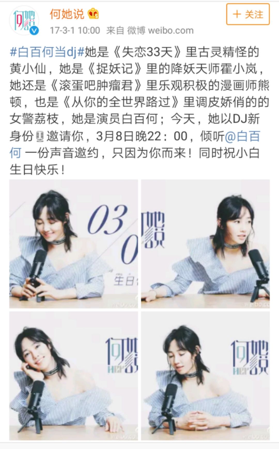2017年,白百何作为出品人兼主播自创了一款名叫《何她说》的电台广播节目,讲述只属于女人之间的故事。