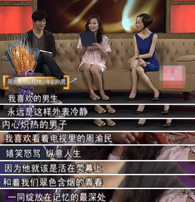 “我喜欢的男生,永远是这样外表冷静,内心炽热的男子。我喜欢看着电视里的周渝民,嬉笑怒骂,恣意人生。因为他就该是活在银幕上,和着我们翠色含烟的青春,一同绽放在记忆的最深处。”