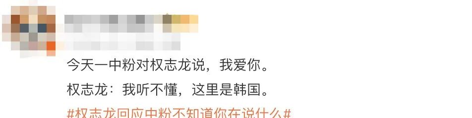 最近权志龙在他的首尔演唱会上,粉丝用中文喊“我爱你”,权志龙回应:“我不知道你在说什么?这里是韩国。”随后用韩语解释“我爱你”即“撒浪嘿”,并比出爱心手势。这个片段被截出后引发网友热议,从外网发酵最后登上内鱼热搜,有湾湾ip的网友还喊话那个粉丝,说权志龙是“拒绝中文”“歧视中粉”。