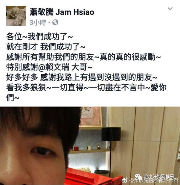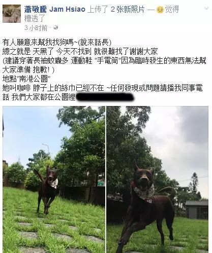 萧敬腾亲自把咖啡抱下了山...随后把好消息po到了网上,感谢了所有帮助寻咖啡的网友们