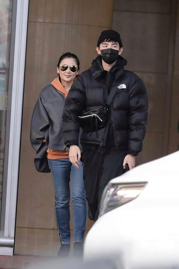 这次也是被别人抓拍的,可以看到这个时候整个人打扮的,看起来确实会显得比较的年轻一点点,因为她里面穿了一件卫衣,选择的颜色是橘红色的,外面套了一件黑色的外套,下面就穿了一条牛仔裤,颜色还是比较深的那一种