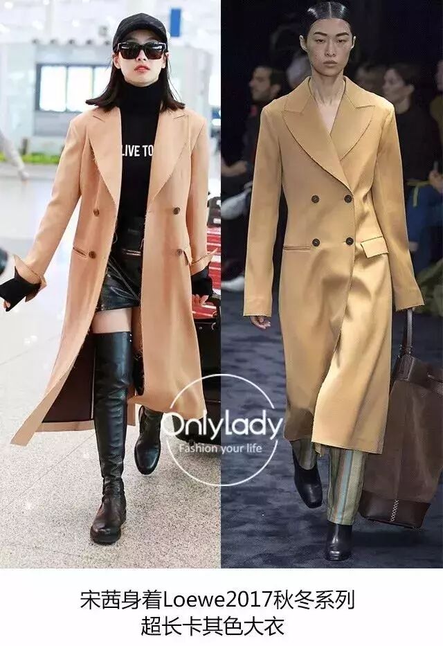 前段时间宋茜就穿了件今年流行的卡其色大衣~款式是Loewe 2017秋冬系列的。