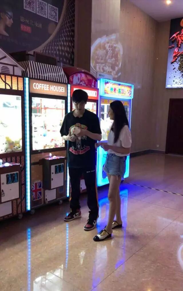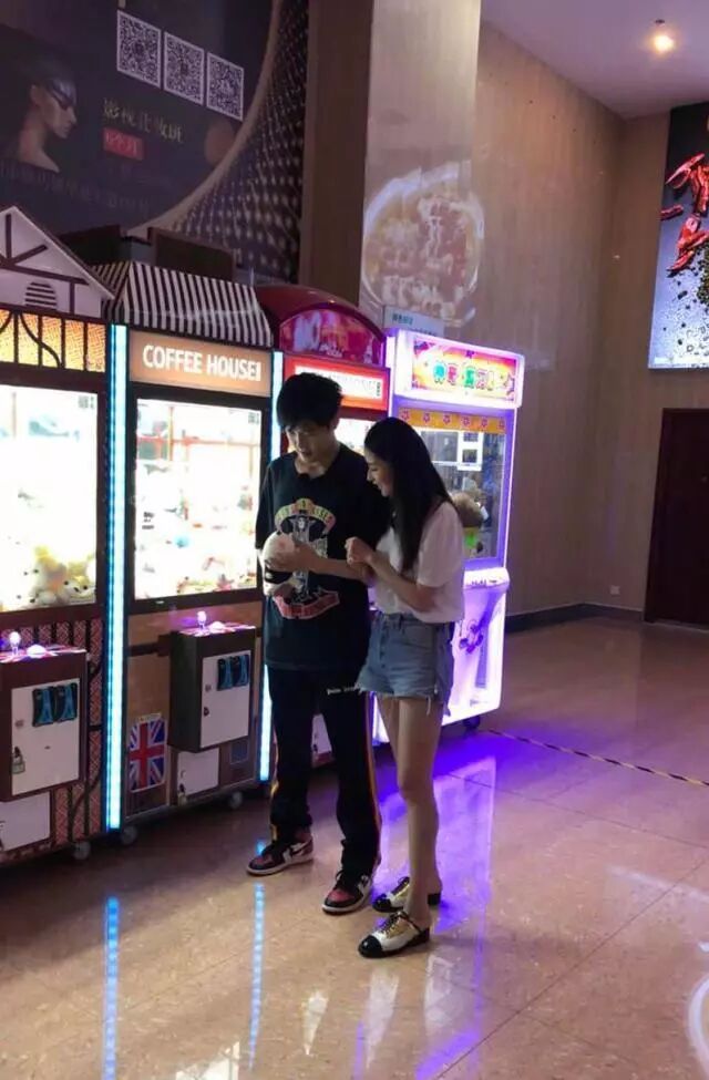 照片中颖儿身穿白色T恤搭配牛仔短裤,非常青春,活力十足,付辛博则身穿黑色T恤和黑色长裤,一副休闲打扮。