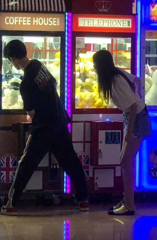 从照片中可以看到,付辛博正在抓娃娃,一旁的颖儿不自主地动作和老公同步,默契满分。