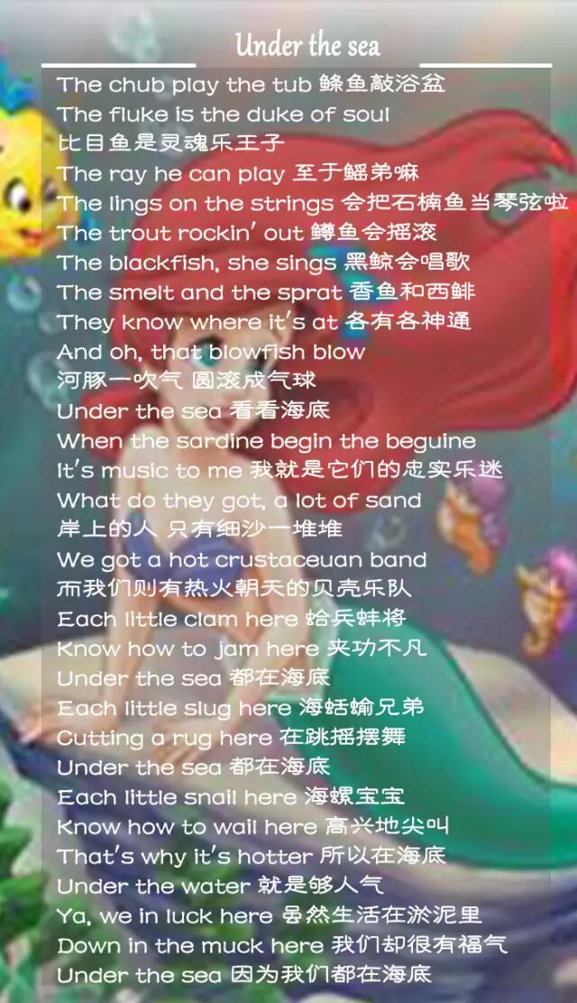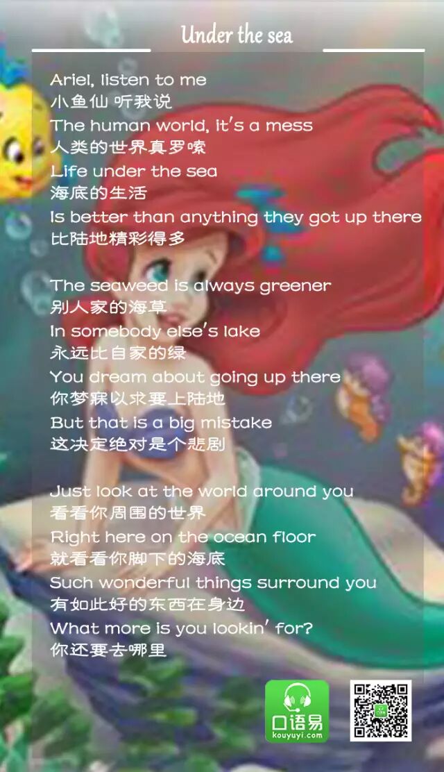 The little mermaid(美人鱼) called Ariel is a friendly and outgoing(开朗的)priness.She is the youngest daughter of King Triton.Ariel loves a prince but she's forbidden(阻止) to go on land,so she goes to Ursula's (女巫名称)to become a human.But she doesn't konw Ursula's evil(邪恶的) thoughts...