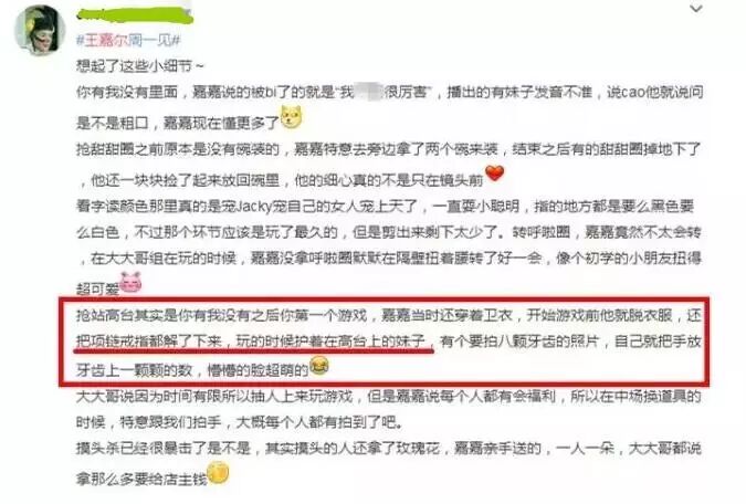 许多参与录制的粉丝写了后记,把很多未播出的细节都分享了出来。有说王嘉尔玩高台游戏的时候,脱衣服把项链戒指都摘掉了,怕不小心会伤到大家。