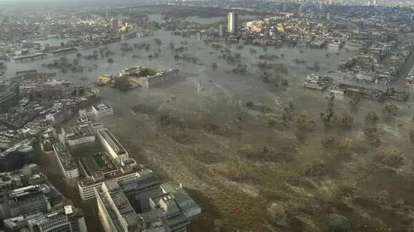 电影讲的是由飓风带引起的洪水泛滥,一开始在海水在沿海地区登陆,但是一步步紧逼内陆地区......直冲伦敦。