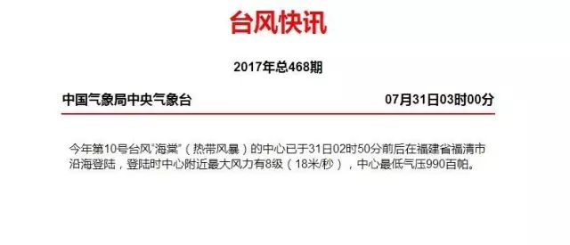 台风"海棠"于今天02时50分在福清市沿海登陆,登陆时中心附近最大风力8级(18米/秒,热带风暴级),中心最低气压990百帕。