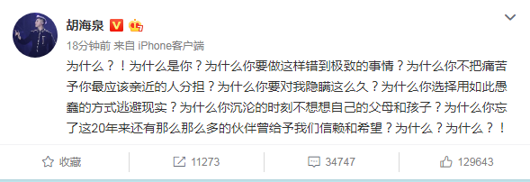 28日下午,“羽泉”组合胡海泉痛心发文,连发十个“为什么”质问陈羽凡,微博原文如下: