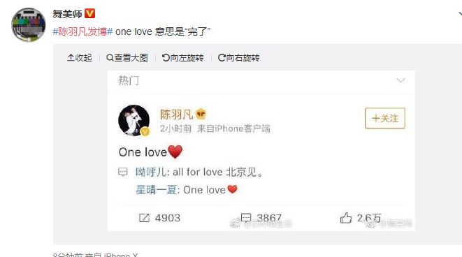 陈羽凡个人微博也在同日稍晚时也更新内容:one love
